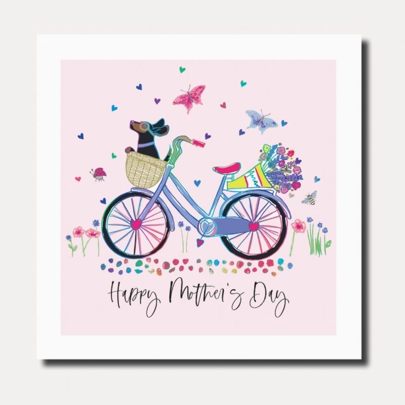 Bike with dog Mother's Day Card by Marina B with foil detail, printed on premium 350 gsm board for a high-quality feel.