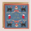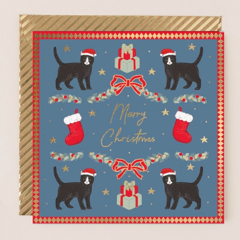 This beautiful black cats Merry Christmas card by Apple & Clover features gold foil print and a gold foil, stripe envelope.