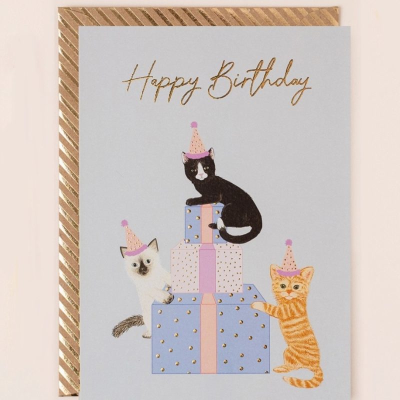 Happy Birthday Cats and Presents - Gold Foiled Apple & Clover Card