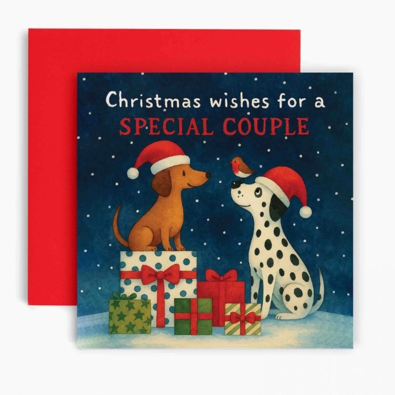 Send heartfelt holiday cheer with this elegant Christmas card that reads “Christmas Wishes to a Special Couple.” Featuring two adorable dogs surrounded by festive presents, it’s the perfect way to celebrate love, warmth, and togetherness this season.