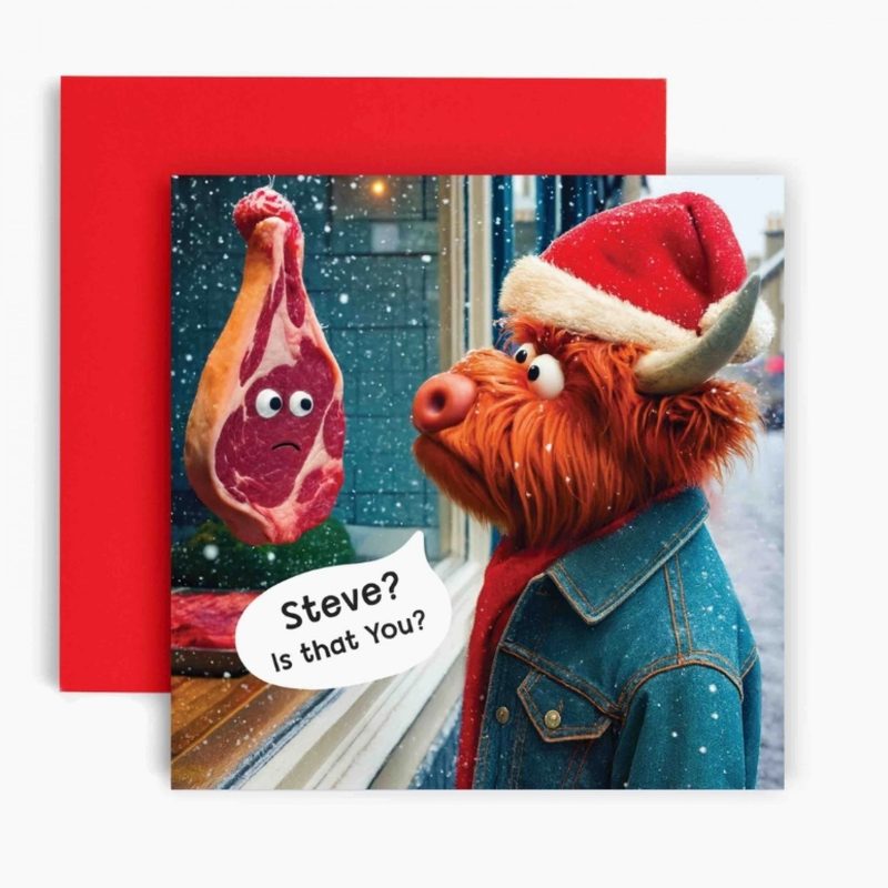 Cow versus Steak humorous Christmas card from Huxters - "Steve is that you?"