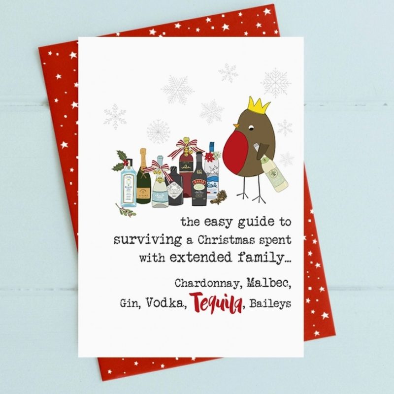 the easy guide to surviving a Christmas spent with extended family...Chardonnay, Malbec, Gin, Vodka, Tequila, Baileys Card by Dandelion Stationery.