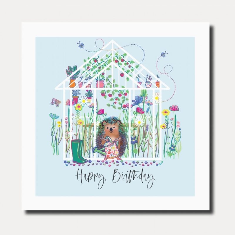 Hedgehog in the Greenhouse, Birthday Card by Marina B with foil detail, printed on premium 350 gsm board for a high-quality feel.