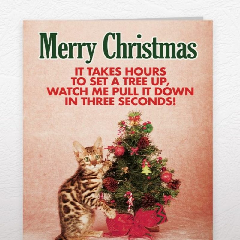It takes hours to set a tree up...Watch me pull it down in three seconds! Funny Retro Greetings Card