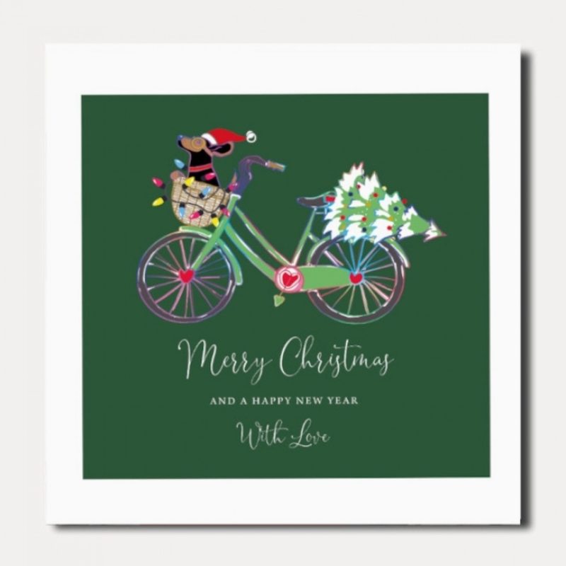 Beautiful Dog in bike basket with lights and Christmas tree Card by Marina B